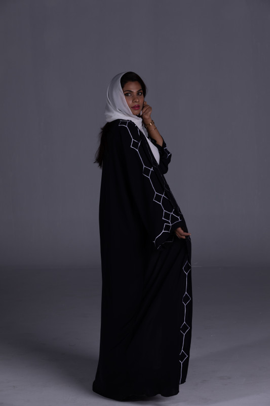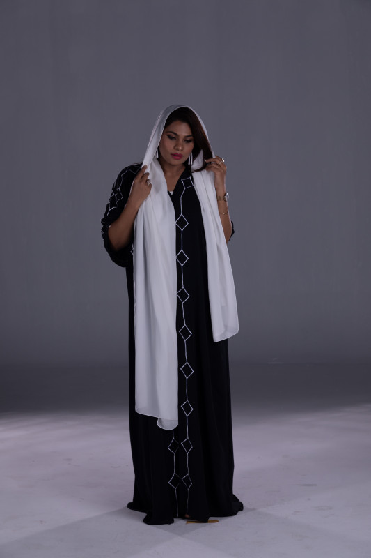 Type: Black Shade Abaya, Custom Color fabric Abaya, White Embroidery work, Casual Wear,  Tailor Designed, Front Open