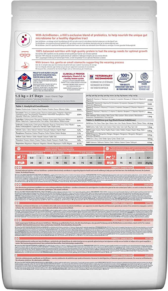 Hill’s Science Plan PERFECT DIGESTION Kitten food with Chicken & Brown Rice Contains ActivBiome+, a Hill’s exclusive blend of prebiotics to nourish your Cat’s unique microbiome and help them reach their full potential.