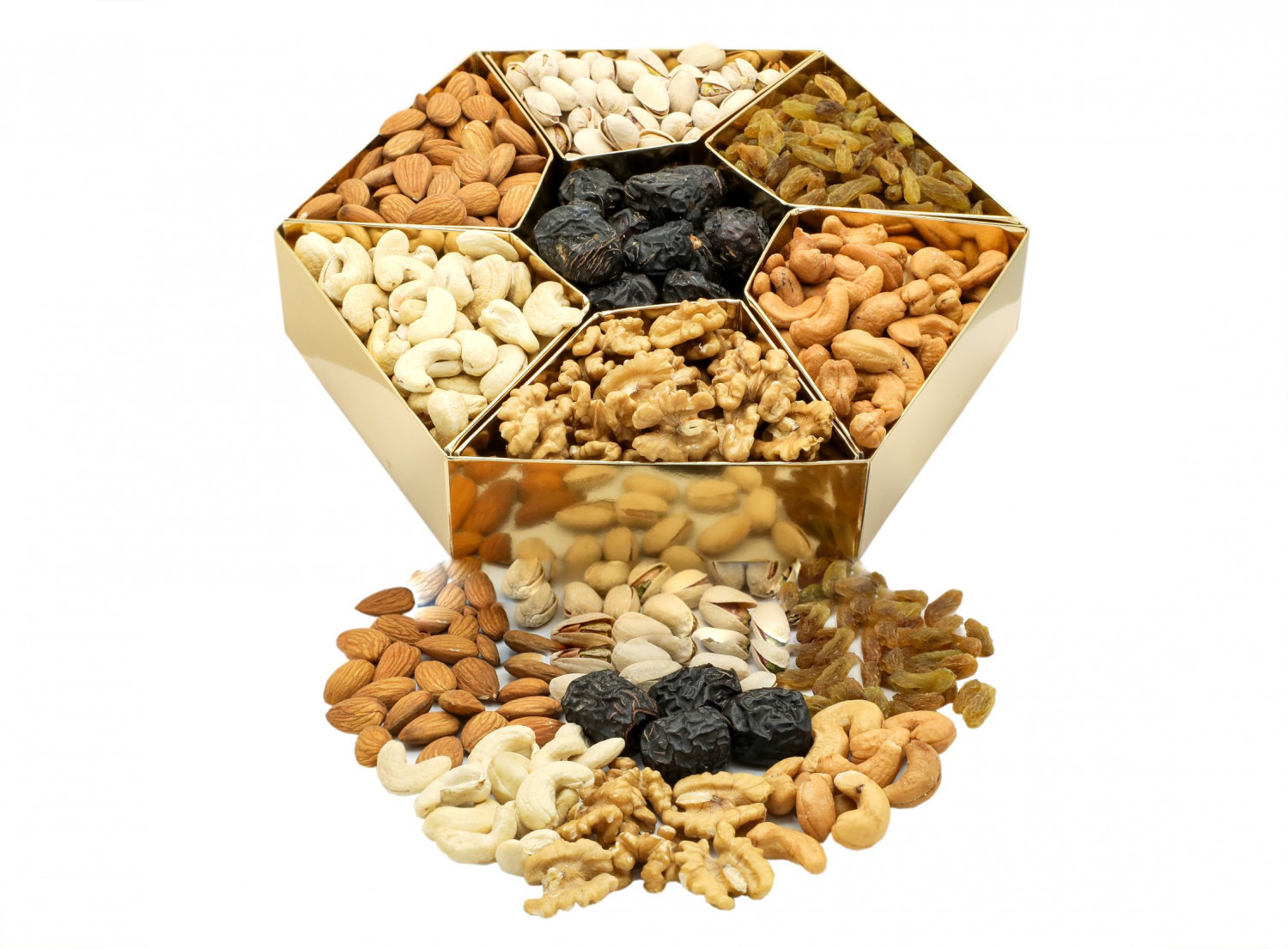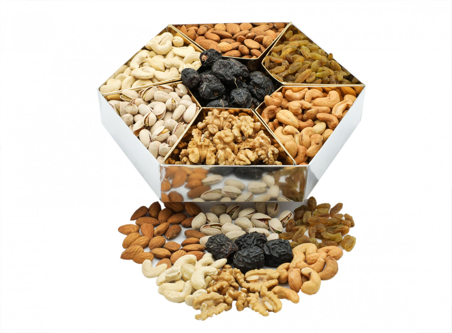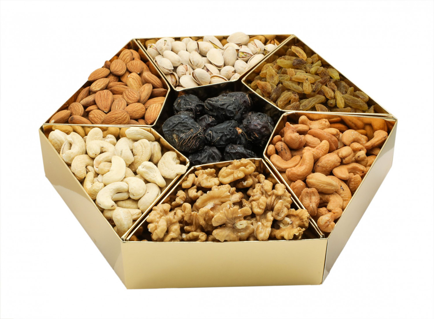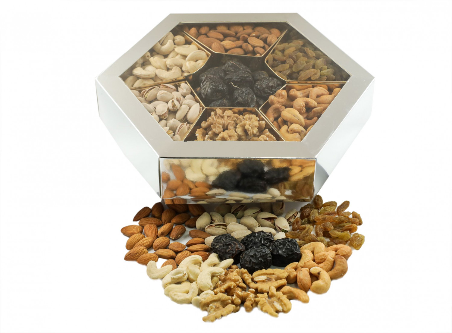 It includes pistachio, almond, plain cashew nut, salted cashew nut, rasins, ajwa dates and walnut.