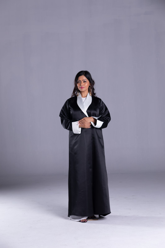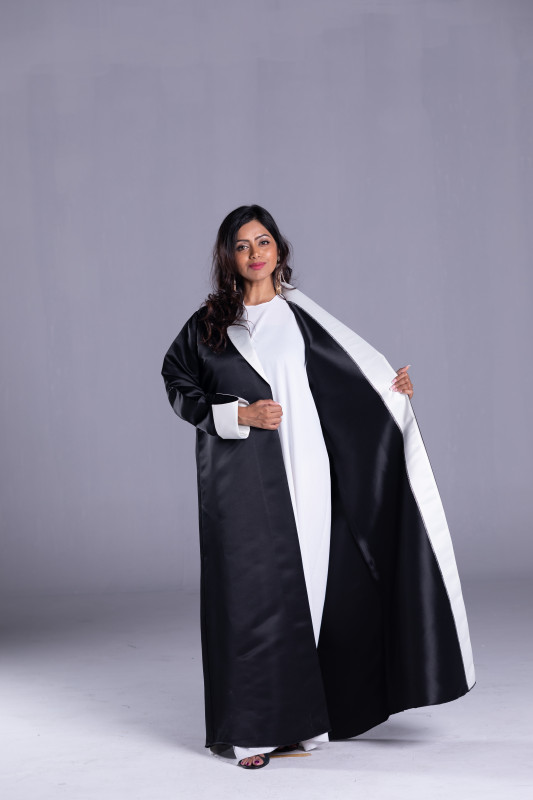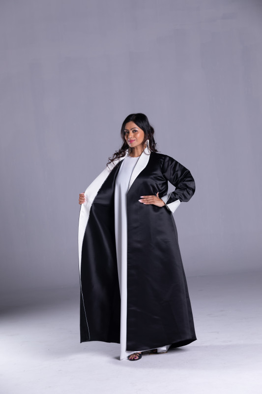 Type: Bridal Sattin Abaya, Casual Wear, Black and White, Custom Color fabric Abaya, Tailor Designed, Front Open